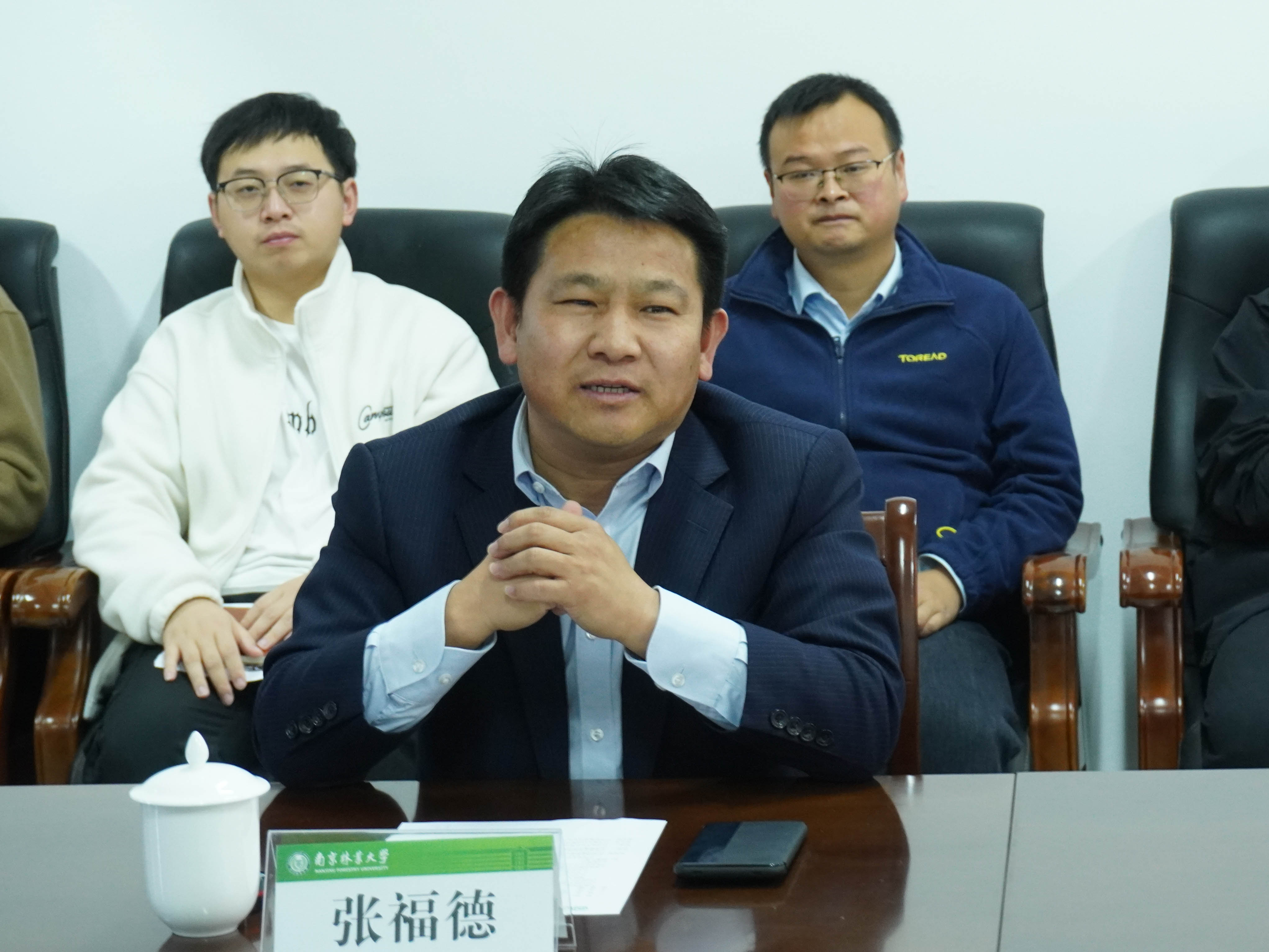 淮安校區黨工委常務副書記、管委會常務副主任秦天堂代表校方對江蘇evo真人视讯科技(集團)股份有限公司張福德董事長一行的到來表示歡迎,并簡要介紹了學校秉承校訓,多年來服務地方經濟建設的“樹木”科研成就,以及在“三全育人”過程中形成的“樹人”特色文化。他表示,優秀校友是學校最好的“名片”,張福德校友心系母校、與母校守望相助的情懷和攻堅克難的創業歷程令人感動和振奮,期待雙方以此為契機,攜手奮進,互促共進、互惠共贏。