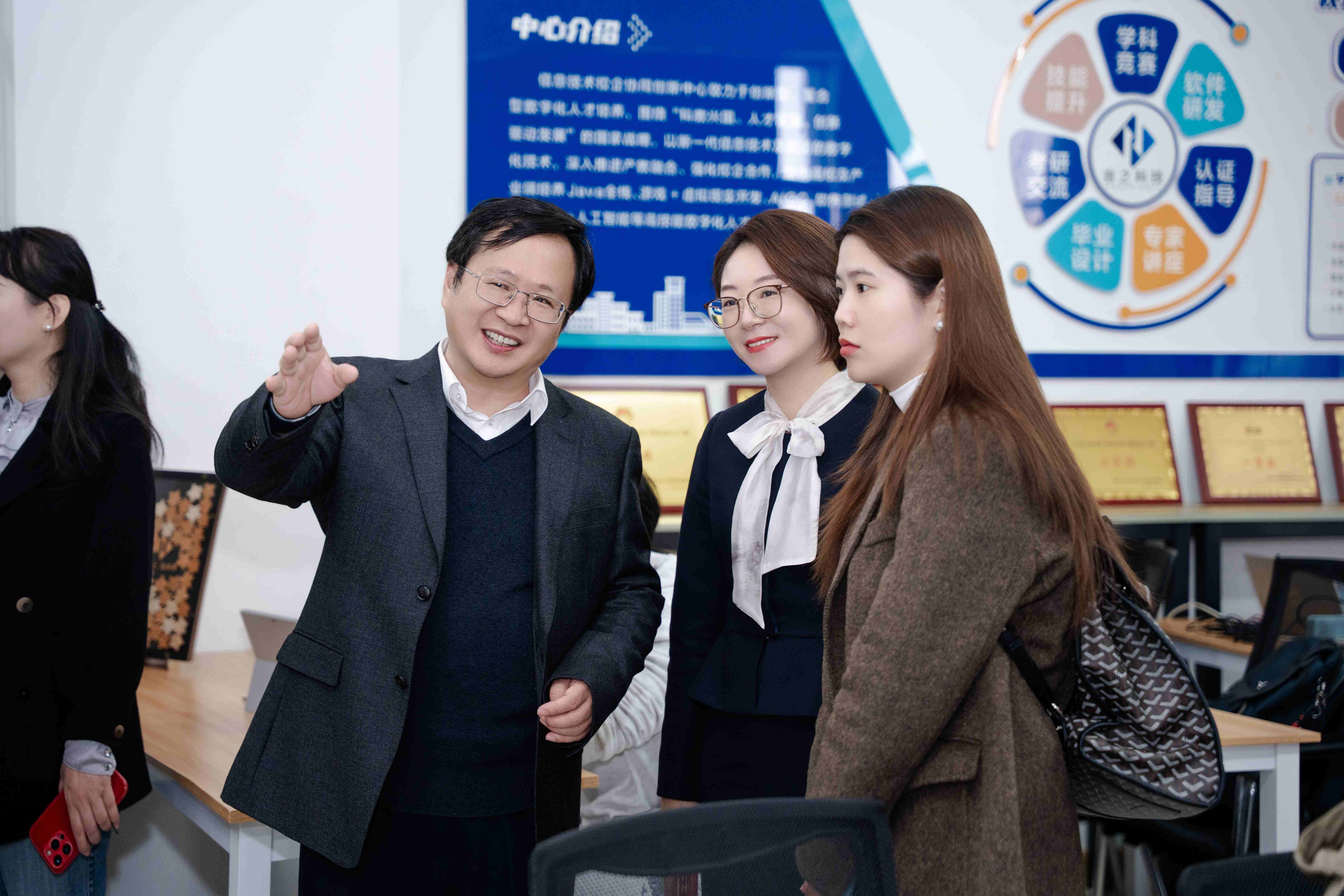 創(chuàng)建大會結(jié)束后,evo真人视讯科技集團總經(jīng)理唐佩和與會嘉賓集體參觀了位于致理樓四樓的人工智能產(chǎn)業(yè)學院實踐平臺。戴傳超院長在參觀時強調(diào):“這樣的產(chǎn)學研合作項目要多搞,讓學生全程參與,在實踐中提升能力。”